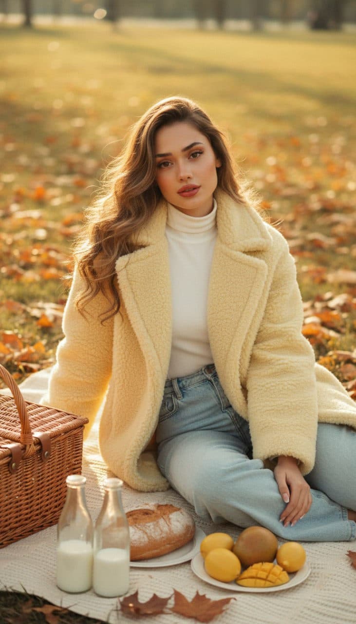 Inside you'll find prompts such as "Using the person in the uploaded reference image, recreate this scene: use the user’s appearance 1:1 — face, skin, hair, and body unchanged. Create a soft cinematic autumn picnic portrait: the person from the reference image sits on a cream blanket in a sunlit park, surrounded by golden leaves. Wearing a fluffy pale-yellow oversized coat over a fitted turtleneck and wide light-wash jeans, they look at the camera with a calm, elegant expression. Natural refined makeup with red lips and soft blush. In the foreground — a wicker basket, bread, a plate with yellow fruits, and two vintage glass milk bottles. Shot from a slightly high angle, with editorial balanced framing. Soft golden-hour light, creamy highlights, and a warm nostalgic mood. Vintage-inspired tones: buttery yellow, beige, soft green. Subtle film grain, painterly texture, shallow depth, cinematic 8K composition, warm harmony, fashion-magazine aesthetic. —v 6 —ar 3:4 —style raw —q 2 —s 250." that cover the hero looks from the shoot. Model presets include nano-banana so you can keep renders on-genre. Aspect ratio guidance like portrait_16_9 keeps compositions print-ready. Use the prompt notes below to match wardrobe details, framing, and mood before you hit remix.