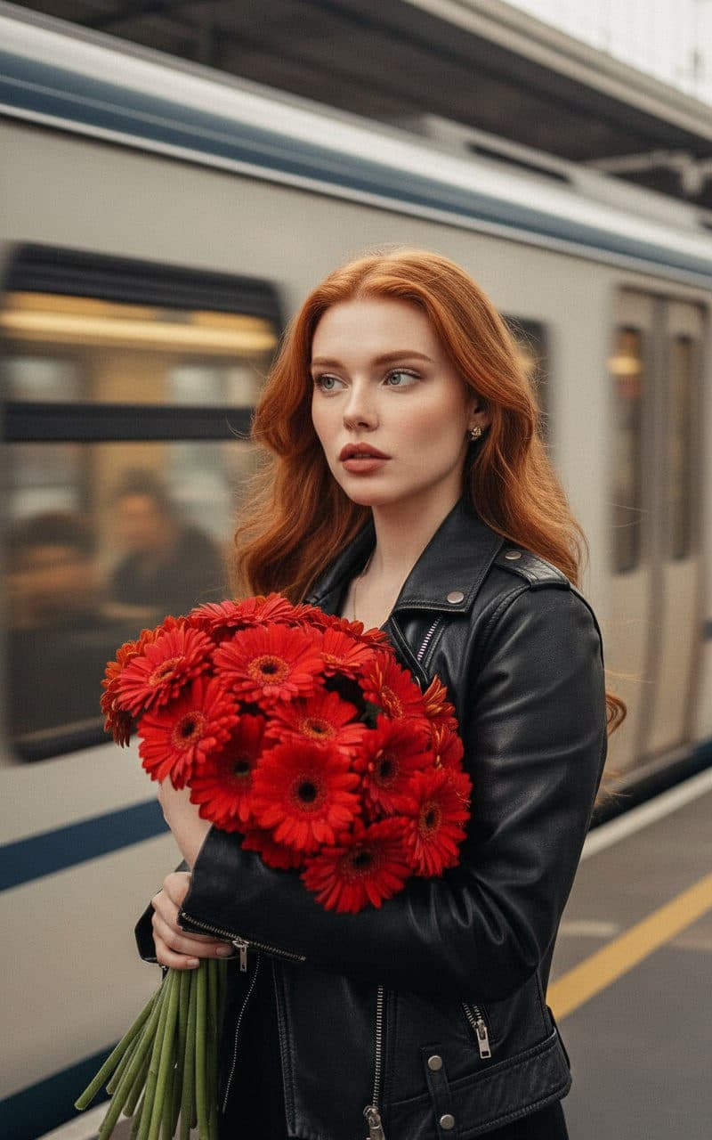 Inside you'll find prompts such as "Using the person in the uploaded reference image, recreate this scene: create a realistic cinematic portrait on the person from the reference image stands holding a large bouquet of bright red gerberas, wearing a leather jacket with hair lightly blowing in the wind. Waist-up composition with a moving train in the background creating a motion blur effect. Soft, natural lighting with warm, muted tones. The expression is thoughtful, looking away from the camera. Cinematic portrait style, moody atmosphere, natural light, shallow depth of field, realistic textures, film grain, warm tones, realistic style, cinematic light, and soft contrast." that cover the hero looks from the shoot. Model presets include nano-banana so you can keep renders on-genre. Aspect ratio guidance like portrait_16_9 keeps compositions print-ready. Use the prompt notes below to match wardrobe details, framing, and mood before you hit remix.
