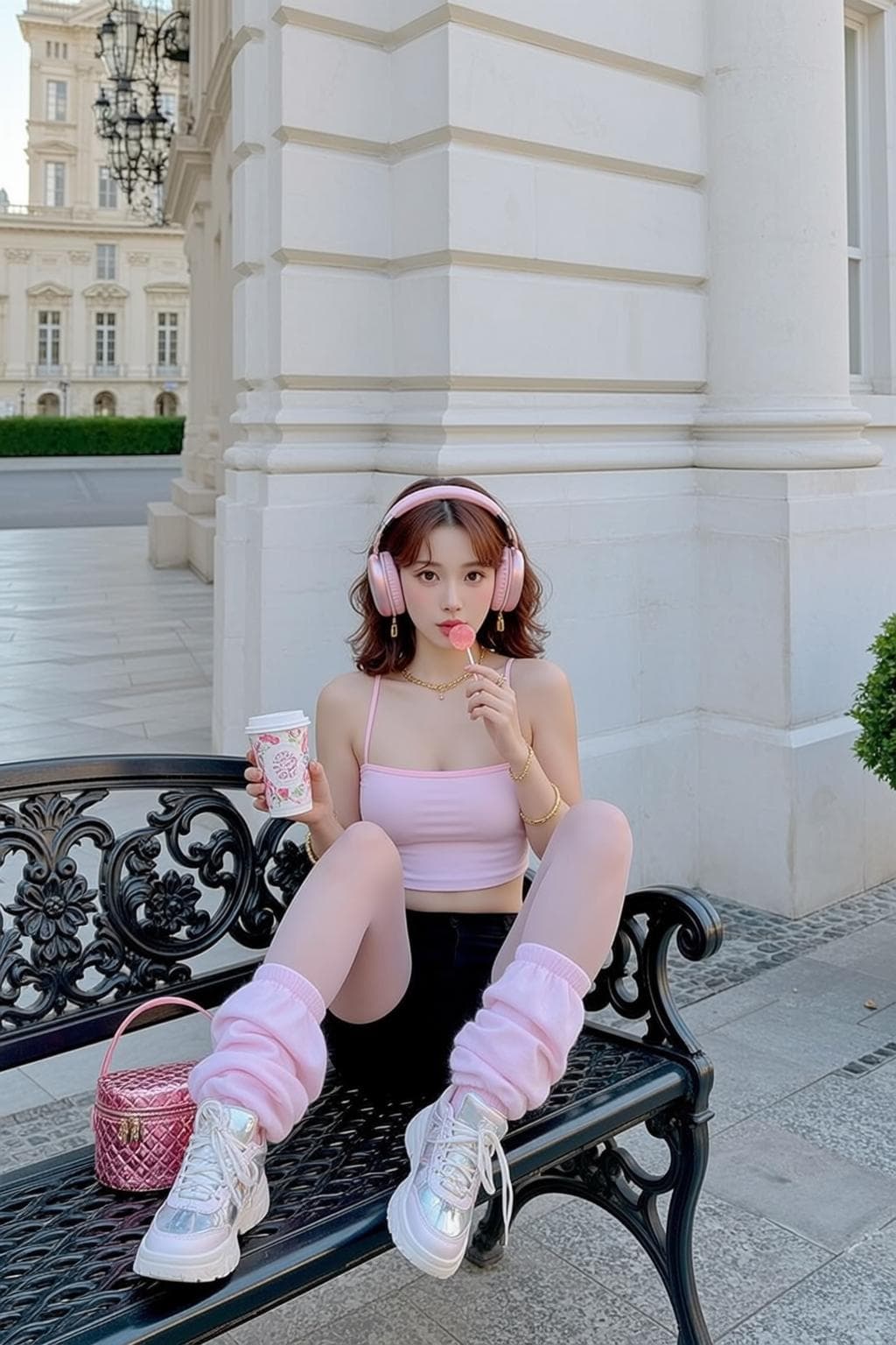 Inside you'll find prompts such as "Using the person in the uploaded reference image (Do not change facial features), recreate this scene: prompt: {"subject":{"description":"a young woman","hair":"short, wavy, brown","skin":"fair"},"apparel":{"top":"pink spaghetti strap crop top","bottom":"black shorts","other":"pink leg warmers, white socks"},"accessories":{"eyewear":"","jewelry":[{"necklace":"gold chain","bracelet":"gold bangle"}],"other":"pink headphones, pink lollipop, pink patterned cup, pink quilted bag","tattoos":[]},"pose_and_expression":{"pose":"sitting on a bench, holding a cup and a lollipop","expression":"looking at the camera, slight smile"},"environment":{"location":"outdoor, in front of a white building with columns","surface":"paved ground, black metal bench","objects":["cup","lollipop","bag","headphones","bench"]},"photography_style":{"lighting":"natural, bright sunlight","aesthetic":"photorealistic"}} fea" that cover the hero looks from the shoot. Model presets include nano-banana so you can keep renders on-genre. Aspect ratio guidance like portrait_4_3 keeps compositions print-ready. Use the prompt notes below to match wardrobe details, framing, and mood before you hit remix.