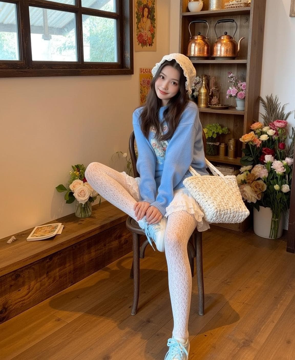 Inside you'll find prompts such as "Using the person in the uploaded reference image (Do not change facial features), recreate this scene: prompt: {"subject":{"description":"young East Asian woman","hair":"long straight dark hair with curtain bangs","skin":"fair smooth skin"},"apparel":{"top":"light blue crewneck sweater with colorful floral embroidery","bottom":"white ruffled frilly skirt","other":"white lace-top thigh-high stockings, white sneakers with light blue accents"},"accessories":{"eyewear":"","jewelry":[],"other":"white beret hat, white woven handbag","tattoos":[]},"pose_and_expression":{"pose":"sitting sideways on wooden chair with right leg crossed over left, hands holding handbag on lap, right foot dangling","expression":"gentle smiling expression looking at viewer"},"environment":{"location":"cozy indoor room with wooden walls and window","surface":"wooden chair on wooden floor","objects":["wooden shelves"," polished copper teakettles on upper shelf","stacked white porcelain teacups and saucers on middle shelf","tall clear glass vases brimming with clusters of soft pink roses","medium clear glass vases filled with white roses and eucalyptus leaves","small glass vases holding pale orange daisy-like flowers","lush potted plant with broad dark green leaves in textured ceramic pot","framed Madonna icon print mounted on rustic wooden wall","low rustic wooden bench with open beige hardcover book and scattered papers"]}}" that cover the hero looks from the shoot. Model presets include nano-banana so you can keep renders on-genre. Aspect ratio guidance like portrait_4_3 keeps compositions print-ready. Use the prompt notes below to match wardrobe details, framing, and mood before you hit remix.