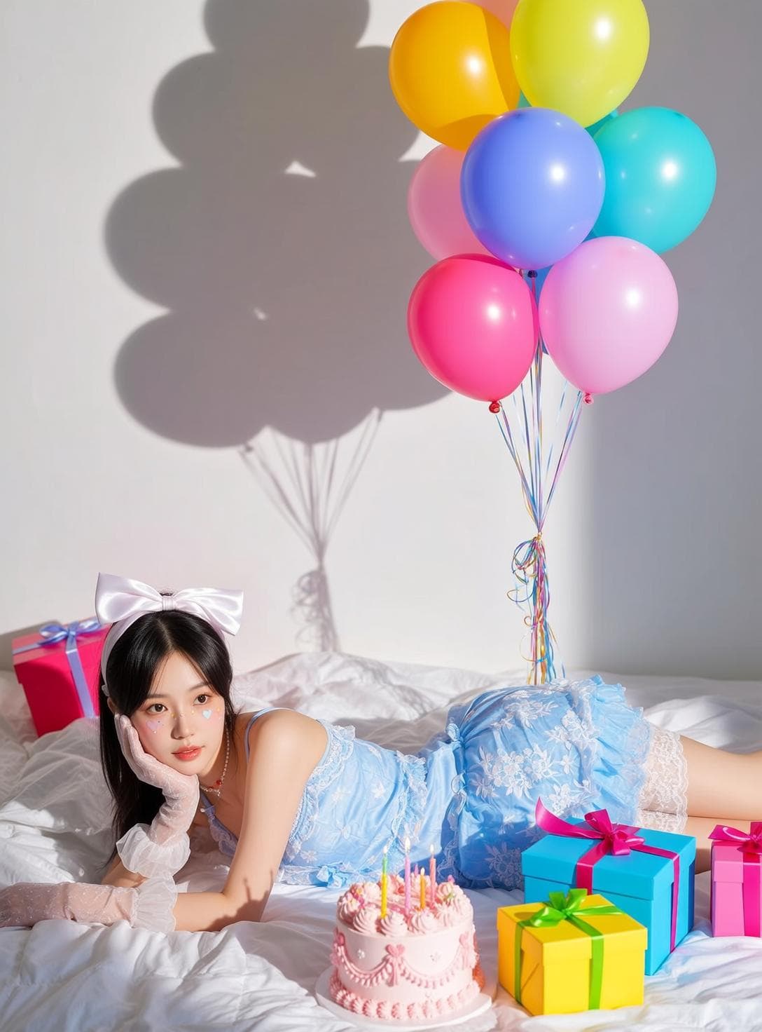 Inside you'll find prompts such as "Using the person in the uploaded reference image (Do not change facial features), recreate this scene: prompt: {"subject":{"description":"a young Asian woman","hair":"long, black, straight","skin":"fair"},"apparel":{"top":"light blue lace trim slip dress","bottom":"","other":""},"accessories":{"eyewear":"","jewelry":[{"necklace":"pearls"}],"other":"","tattoos":[]},"pose_and_expression":{"pose":"lying on her side, propped up on her elbow, looking to the side","expression":"calm, slightly wistful"},"environment":{"location":"indoors, on a bed","surface":"white linen sheets","objects":["pink birthday cake with candles","bunch of colorful balloons","pink gift box","blue gift box","yellow gift box","pink gift box","white bow headband","white sheer gloves"]},"photography_style":{"lighting":"soft, natural light with strong shadows","aesthetic":"dreamy, whimsical, birthday celebration"}}, featur" that cover the hero looks from the shoot. Model presets include nano-banana so you can keep renders on-genre. Aspect ratio guidance like portrait_4_3 keeps compositions print-ready. Use the prompt notes below to match wardrobe details, framing, and mood before you hit remix.