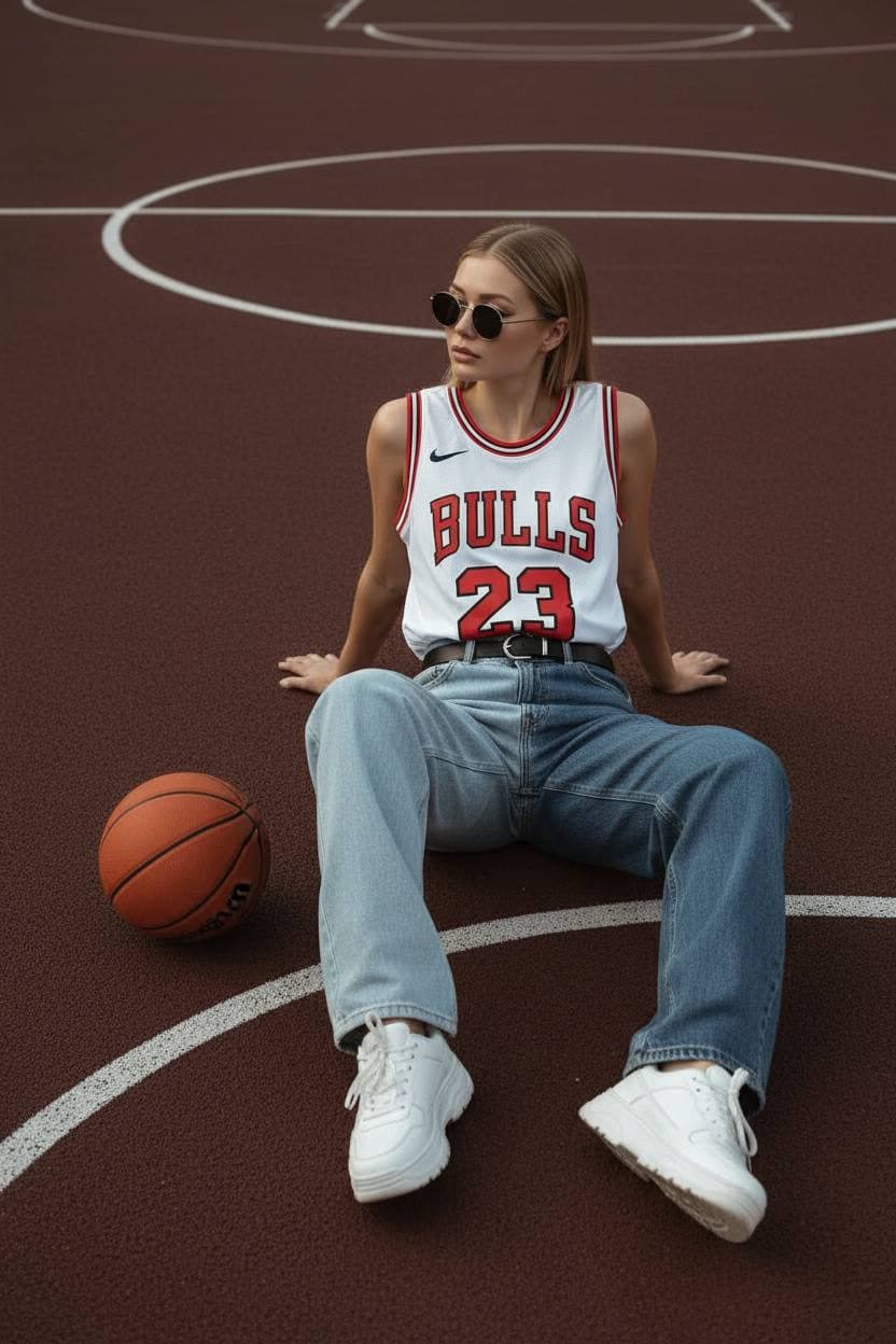 Inside you'll find prompts such as "Using the person in the uploaded reference image, recreate this scene: use the user's appearance 1:1 — face, skin, hair, and body without any changes. the person from the reference image sitting casually on a dark reddish-brown outdoor basketball court, with court lines visible in the person from the reference image wears stylish round sunglasses. They are dressed in a sleeveless Nike Bulls '23' jersey, distinctive two-tone baggy jeans (light blue on the right leg, dark blue on the left leg), a belt, and chunky sneakers. A basketball rests on the person from the reference image is posed looking away to the left, creating a relaxed, contemplative, and cool streetwear vibe. The lighting is soft, natural, and diffused, with no harsh shadows. The image features a slightly desaturated, warm-, and vintage film aesthetic, offering high resolution with sharp focus on the subject and a medium depth of field." that cover the hero looks from the shoot. Model presets include nano-banana so you can keep renders on-genre. Aspect ratio guidance like portrait_4_3 keeps compositions print-ready. Use the prompt notes below to match wardrobe details, framing, and mood before you hit remix.