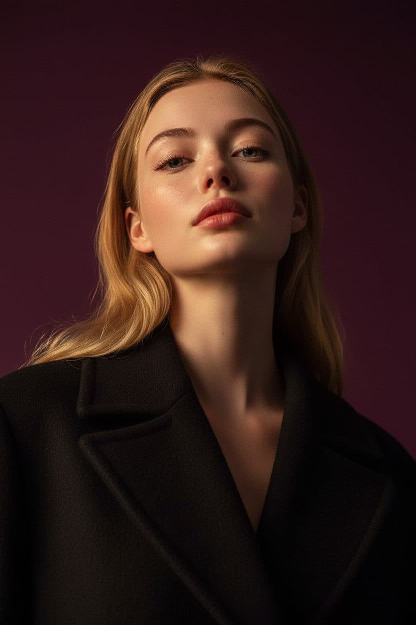 Inside you'll find prompts such as "Use my face 1:1 (expressions, features, skin tone). Vertical portrait 1080x1920 in harsh cinematic lighting, shot from a low angle upwards - emphasizes the jawline and neck, creating a sense of calm superiority. Background is rich purple-red, contrasting with light skin and dark clothing. Directional lighting: warm golden accents on one side, the other in soft velvet shadow. Light highlights bone structure and volume. Neutral expression, cold gaze, relaxed lips. Clothing is a dark coat made of thick wool or felt, textured. Minimal retouching, skin texture preserved. Tight crop, high contrast, mood - high fashion, modern isolation, cinematic power. —ar 9:16 —v 6.0 —style raw —s 200 —no props/accessories." that cover the hero looks from the shoot. Model presets include nano-banana so you can keep renders on-genre. Aspect ratio guidance like portrait_4_3 keeps compositions print-ready. Use the prompt notes below to match wardrobe details, framing, and mood before you hit remix.