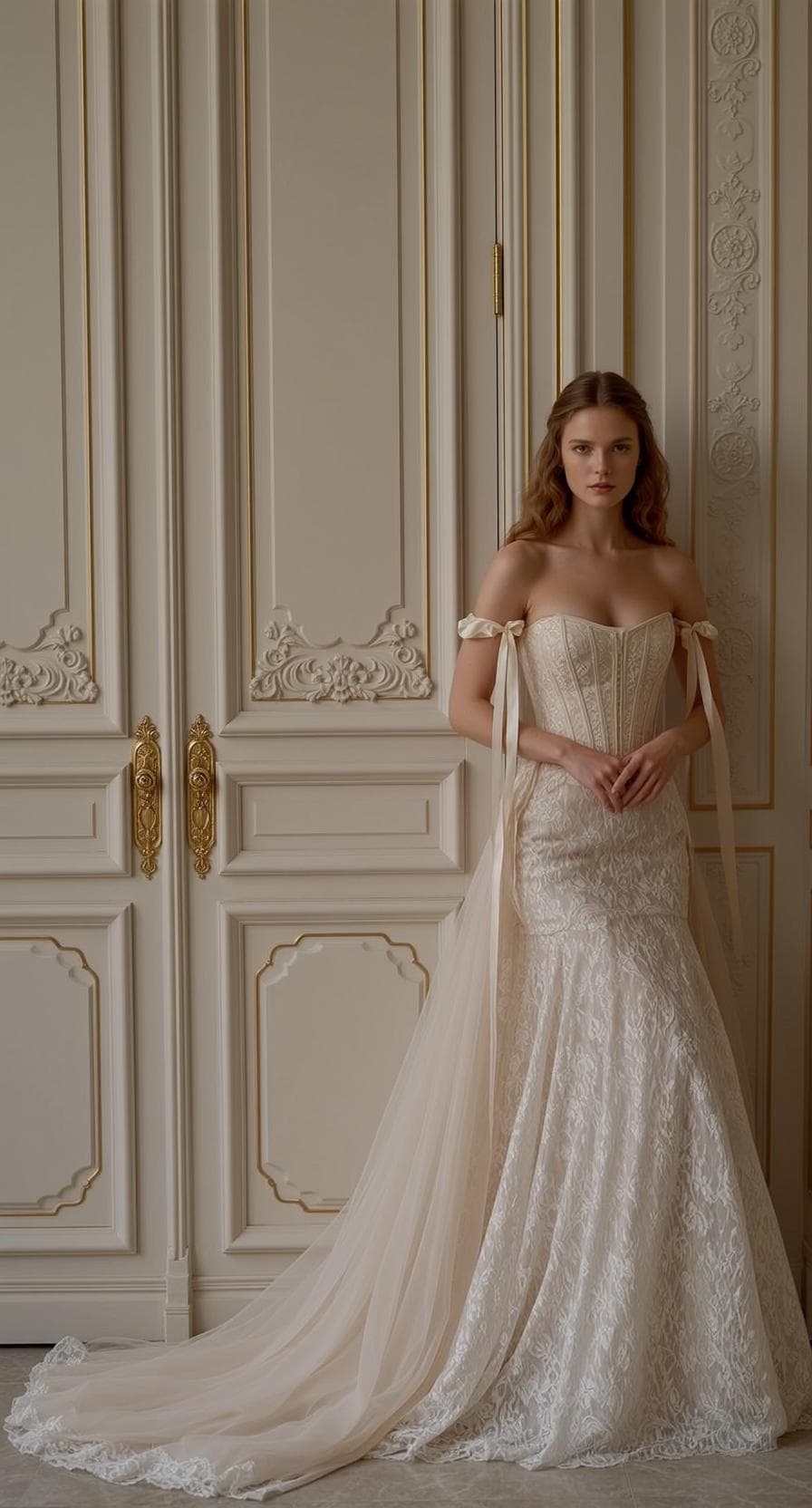 Inside you'll find prompts such as "Woman in the uploaded reference image (keep the face 100% accurate to the reference image) A woman stands facing forward, her head tilted slightly to her left, with a serene and direct gaze. Her shoulders are relaxed, and her arms are bent at the elbows with her hands clasped gently in front of her waist. Her weight appears evenly distributed as she stands with her legs together. She is wearing an off-the-shoulder, strapless ivory wedding gown with a fitted corset bodice adorned with intricate lace detailing and boning. The bodice transitions into a mermaid-style skirt also covered in dense, floral lace. Sheer, flowing tulle panels extend from the off-the-shoulder straps, creating a cape-like effect. The gown has a long, sweeping train. She wears no visible accessories. The lighting is soft and diffused, coming from the front and slightly from the left, casting gentle shadows and creatincreating a soft glow on her skin and the fabric of the gown. She stands against a backdrop of tall, light beige double doors, which are adorned with intricate raised paneling and ornate gold trim. Decorative, sculpted floral and scroll motifs in a matching light beige are visible on the upper sections of the doors, above two elongated, ornate gold door handles. The floor beneath her is a light grey polished stone or tile, reflecting the soft ambient light. Her long, wavy, reddish-brown hair is parted in the middle and flows naturally over her shoulders and down her back." that cover the hero looks from the shoot. Model presets include nano-banana so you can keep renders on-genre. Aspect ratio guidance like portrait_16_9 keeps compositions print-ready. Use the prompt notes below to match wardrobe details, framing, and mood before you hit remix.