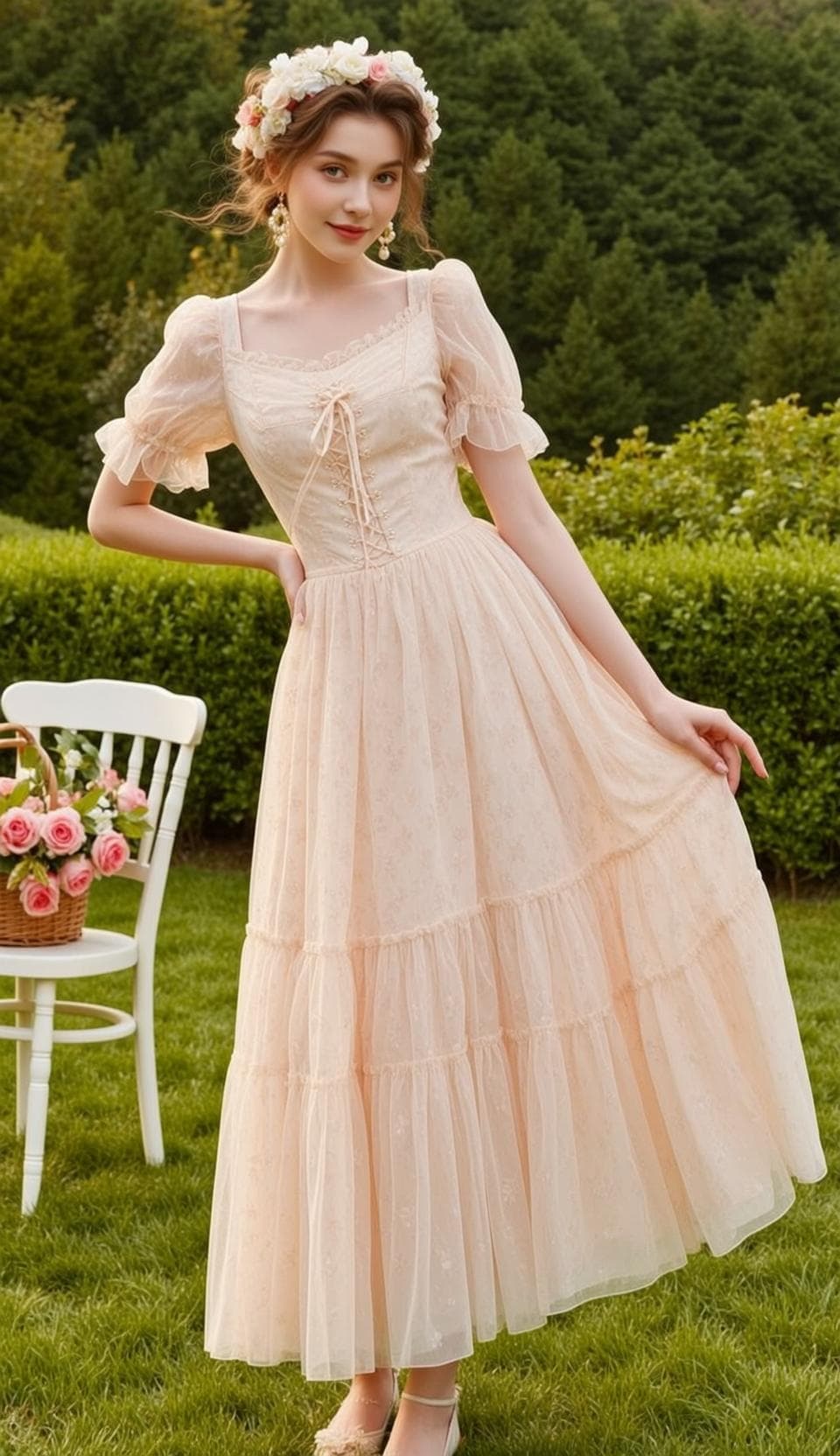 Inside you'll find prompts such as "Woman in the uploaded reference image (keep the face 100% accurate to the reference image) A woman stands in a lush garden, her body angled slightly to the right, with her left hand on her hip and her right hand gently holding the flowing skirt of her dress. Her head is tilted slightly to her left, and her gaze is directed towards the viewer with a soft, alluring expression. She wears a delicate, pale peach, floor-length dress made of sheer, textured fabric with a subtle floral pattern. The dress features a square neckline trimmed with lace, short, puffed sleeves with ruffled cuffs, and a fitted bodice with a lace-up corset detail at the front. The skirt is tiered and gathered, creating a voluminous, ethereal silhouette. She wears simple, light-colored heeled sandals with ankle straps. Adorning her head is a floral crown composed of white and pink roses and greenery. She wears dangling pearl earrings. To her immediate left, a white painted wooden slatted chair stands on the bright green grass. A light brown woven basket filled with numerous pink roses and a few white flowers, along with some green leaves, sits on the seat of the chair. The background consists of a neatly trimmed, dense green hedge, with taller, dark green coniferous trees visible further in the distance. The entire scene is set outdoors on a sunny day with natural light illuminating the garden." that cover the hero looks from the shoot. Model presets include nano-banana so you can keep renders on-genre. Aspect ratio guidance like portrait_16_9 keeps compositions print-ready. Use the prompt notes below to match wardrobe details, framing, and mood before you hit remix.