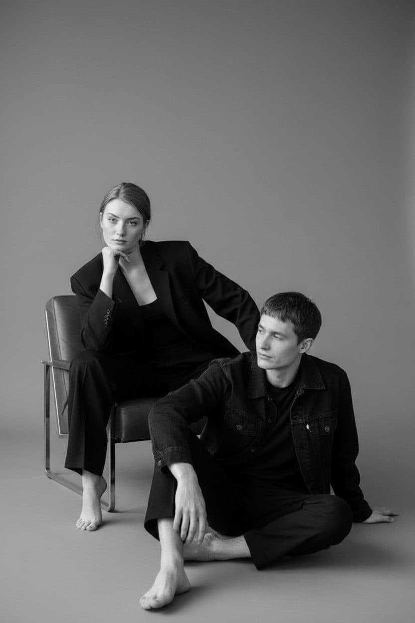 Inside you'll find prompts such as "Using the person in the uploaded reference image, recreate this scene: minimalist high-fashion editorial studio photoshoot in monochrome. and photo with soft diffused lighting emphasizing facial contours and fabric texture. A restrained, confident, and sensual atmosphere with intellectual elegance. Vertical composition, two people posing against the person from the reference image sits in a leather chair, leaning forward with her hand on her chin; the person from the reference image sits on the floor at her feet, leaning on one hand with his head slightly tilted down. Eye-level front shot. the person from the reference image wears an oversized classic suit (blazer and trousers) with the person from the reference image wears a dark shirt or loose denim jacket and simple trousers, barefoot. Contrast lighting, smooth background, no accessories. Natural skin without retouching, sharp focus on poses and interaction. Highly detailed fabric and skin texture." that cover the hero looks from the shoot. Model presets include nano-banana so you can keep renders on-genre. Aspect ratio guidance like portrait_4_3 keeps compositions print-ready. Use the prompt notes below to match wardrobe details, framing, and mood before you hit remix.