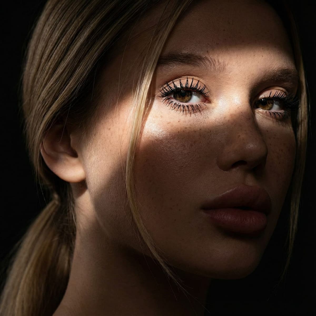 Inside you'll find prompts such as "Using the person in the uploaded reference image, recreate this scene: extremely close-up shot of a face. It is dark, two bright strips of light cross the face, illuminating one eye and part of the face. Hair is tied in a low ponytail with one strand falling over the face. Eyelashes are covered in mascara, lips are full, and there are freckles on the face. Dramatic lighting like a fashion shoot. Perfect skin. 8K quality." that cover the hero looks from the shoot. Model presets include nano-banana so you can keep renders on-genre. Aspect ratio guidance like square_hd keeps compositions print-ready. Use the prompt notes below to match wardrobe details, framing, and mood before you hit remix.