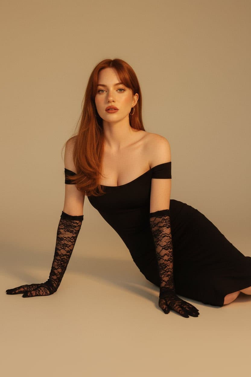 Inside you'll find prompts such as "Using the person in the uploaded reference image, recreate this scene: use the user's appearance 1:1—face, skin, hair, and figure without changes. Realistic studio photo with soft cinematic light and a warm analog palette. The user is in the center of the frame, in a reclining pose leaning on hands and one knee, low camera angle, slightly from below. Hair partially covers the face, confident gaze directly into the camera. Wearing a form-fitting off-the-shoulder dress and elbow-length lace gloves. Minimalist beige-sand background without details. Soft warm side lighting creates smooth shadows and skin glow. Caramel, coffee-gold palette with light film grain. 90s fashion editorial style with soft bokeh and emphasis on texture. 8K photorealism, intimate and sophisticated atmosphere. --ar 3:4 --v 6 --style raw --s 250" that cover the hero looks from the shoot. Model presets include nano-banana so you can keep renders on-genre. Aspect ratio guidance like portrait_4_3 keeps compositions print-ready. Use the prompt notes below to match wardrobe details, framing, and mood before you hit remix.
