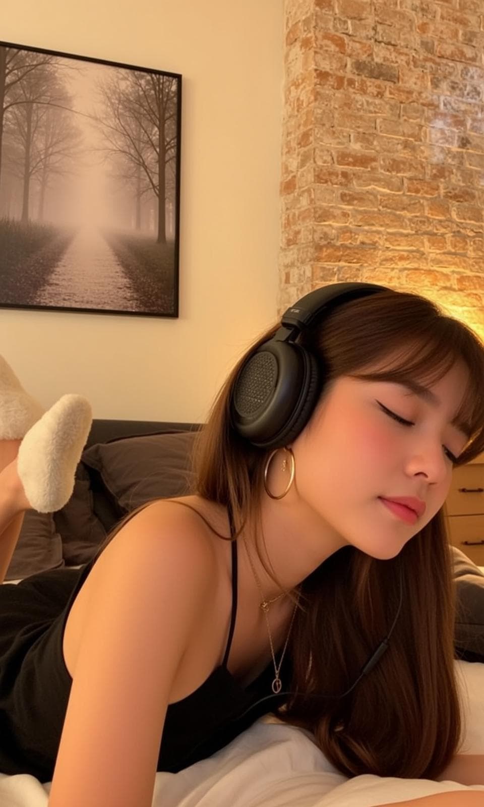 Inside you'll find prompts such as "Using the person in the uploaded reference image (Do not change facial features), recreate this scene: prompt: {"subject":{"description":"young woman","hair":"long straight dark brown hair with curtain bangs","skin":"fair with rosy cheeks"},"apparel":{"top":"black spaghetti strap slip dress","bottom":"","other":"white fuzzy sock on left foot"},"accessories":{"eyewear":"","jewelry":["gold hoop earrings","thin gold necklace with circular pendant"],"other":"black over-ear headphones with textured earcups, thin black wire visible near neck","tattoos":[]},"pose_and_expression":{"pose":"lying on stomach on bed, head turned to side, propped on right elbow, left leg bent with foot raised","expression":"eyes softly closed, serene, slight pout, flushed cheeks"},"environment":{"location":"cozy bedroom","surface":"white bedsheets, dark gray pillows","objects":["framed black and white picture of misty tree-lined path","beige wall with exposed red brick column","wooden bedside table with two small drawers"]},"photography_style":{"lighting":"warm yellow side lighting, soft golden highlights on right cheek, hair, and shoulder, gentle shadows under chin and along neckline","aesthetic":"intimate, cozy, serene"}}" that cover the hero looks from the shoot. Model presets include nano-banana so you can keep renders on-genre. Aspect ratio guidance like portrait_16_9 keeps compositions print-ready. Use the prompt notes below to match wardrobe details, framing, and mood before you hit remix.