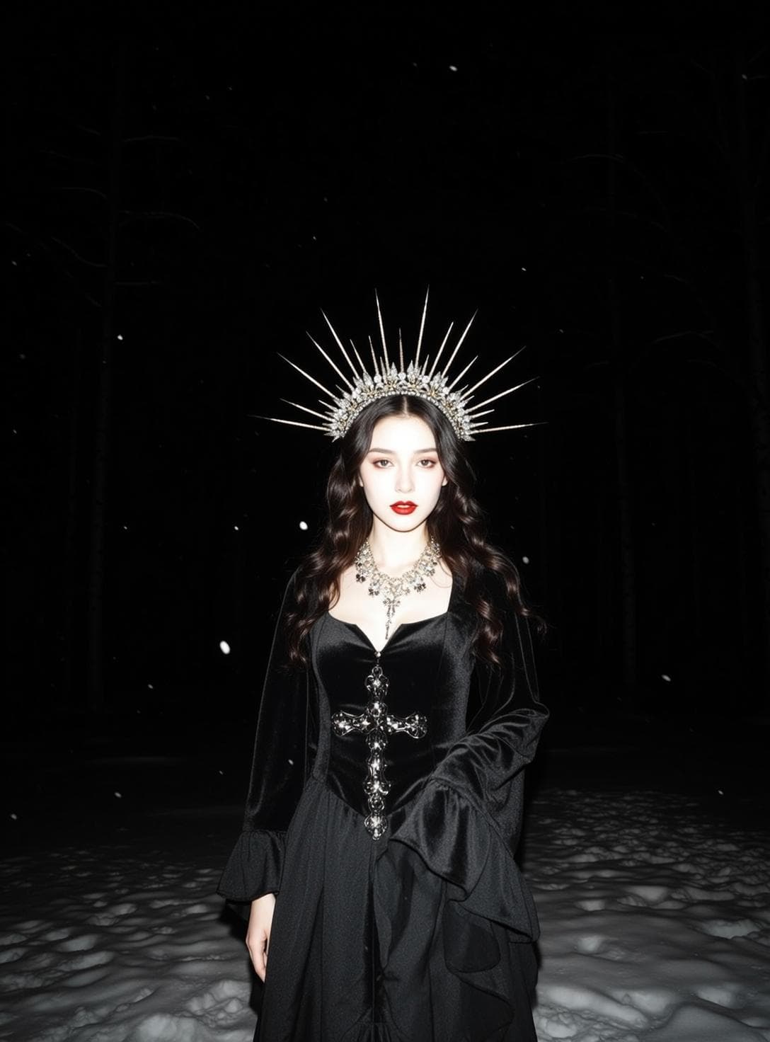 Inside you'll find prompts such as "Using the person in the uploaded reference image (Do not change facial features), recreate this scene: prompt: {"subject":{"description":"a young woman","hair":"long, wavy, dark brown","skin":"pale"},"apparel":{"top":"black velvet corset with a sweetheart neckline","bottom":"long, flowing black skirt","other":"long, bell sleeves"},"accessories":{"eyewear":"","jewelry":[{"necklace":"chunky, silver, with a large cross pendant"}],"other":"a spiky, silver crown with rhinestones","tattoos":[]},"pose_and_expression":{"pose":"standing, facing forward, looking at the camera","expression":"neutral, with red lipstick"},"environment":{"location":"a snowy forest at night","surface":"snow-covered ground","objects":["bare trees in the background","falling snow"]},"photography_style":{"lighting":"dramatic, low-key lighting","aesthetic":"gothic, dark fantasy"}}, featuring a woman with dark hair and pale" that cover the hero looks from the shoot. Model presets include nano-banana so you can keep renders on-genre. Aspect ratio guidance like portrait_4_3 keeps compositions print-ready. Use the prompt notes below to match wardrobe details, framing, and mood before you hit remix.