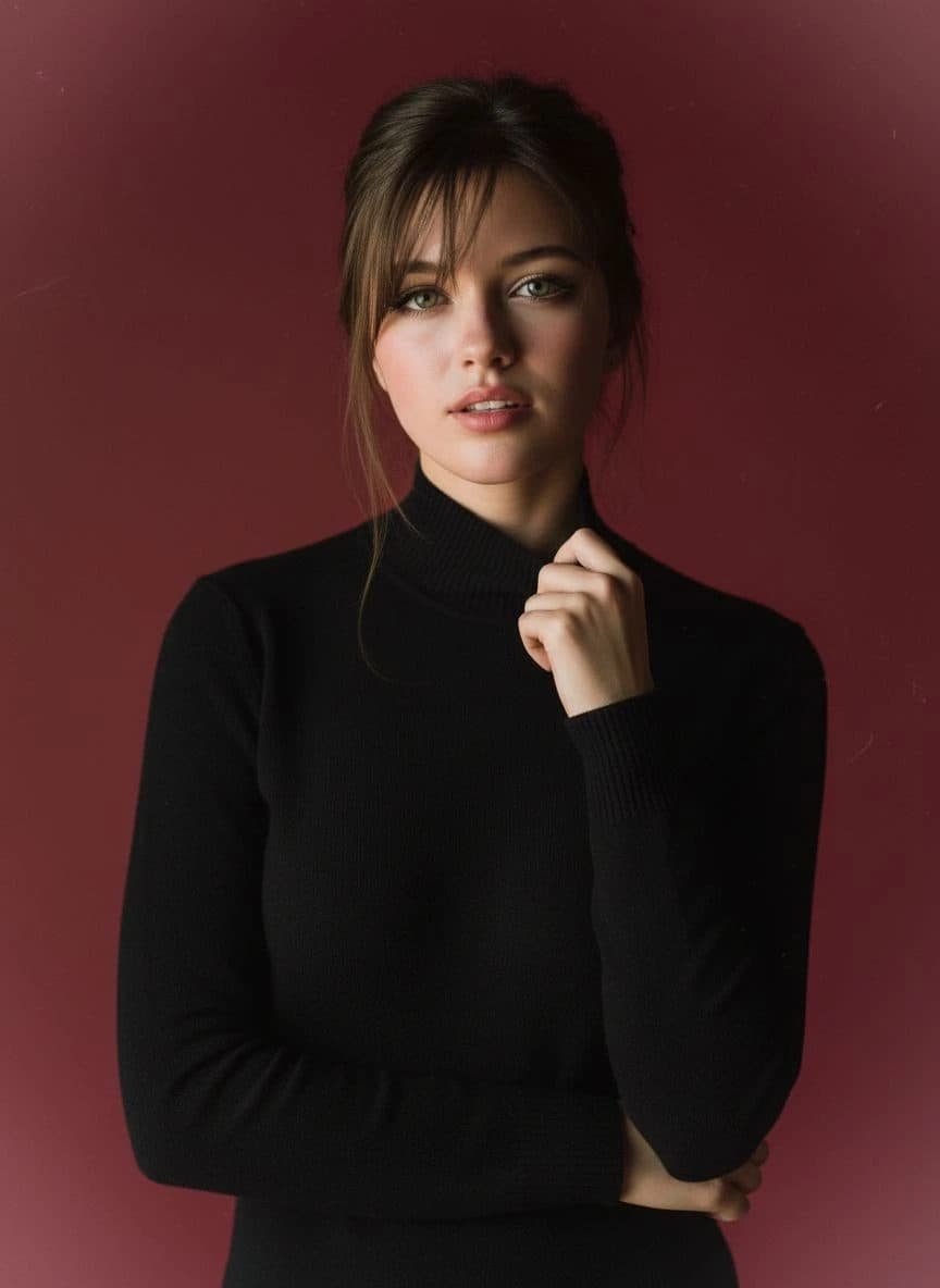 Inside you'll find prompts such as "Use the person in the uploaded image. Do not change or alter the face, bone structure, gender, age, skin tone, hairstyle, or identity. Keep the same hair length and style exactly as in the uploaded photo. Pose: Head slightly tilted downward, eyes looking directly into the camera, creating a strong, mysterious expression. Clothing: A black high-neck sweater. One hand casually touching or lightly adjusting the collar (not covering the mouth). The face remains mostly visible, only a subtle gesture with the hand near the collar. Lighting & Background: Warm, soft studio lighting with a gentle shadow on one side of the face. Dark red background, plain, uniform, no patterns. Slight background blur, delicate film grain, and soft vignette on the edges. Framing: Chest-up portrait, subject centered in the frame. Rendering Style: Photorealistic, high resolution, natural realistic skin texture, no beautification, preserve real facial details and identity." that cover the hero looks from the shoot. Model presets include nano-banana so you can keep renders on-genre. Aspect ratio guidance like portrait_4_3 keeps compositions print-ready. Use the prompt notes below to match wardrobe details, framing, and mood before you hit remix.