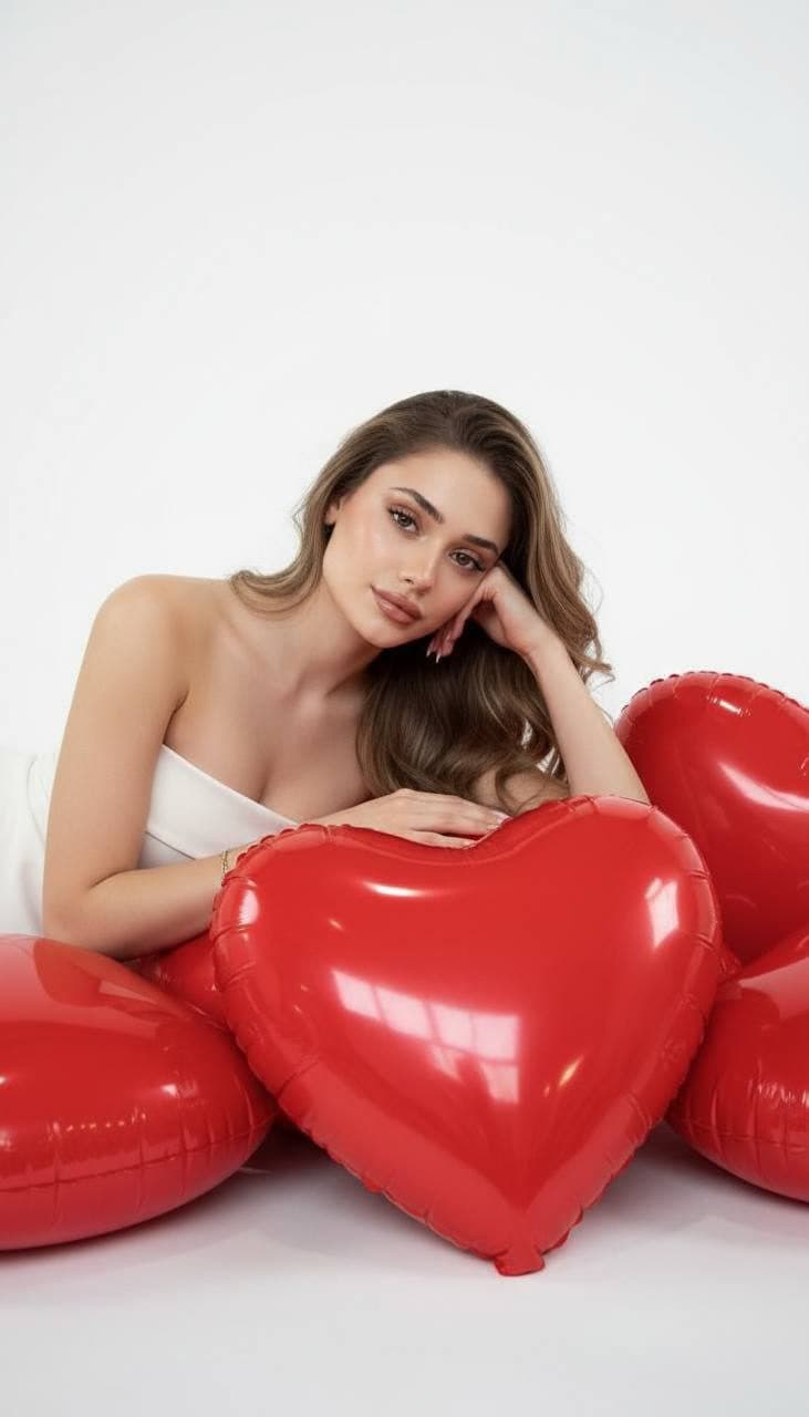 Inside you'll find prompts such as "Using the person in the uploaded reference image, recreate this scene: create the person from the reference image is lying gracefully among large, glossy red heart-shaped pillows on a seamless bright background. Lighting — soft, even studio lighting with delicate shadows that enhance the contours of the face and add depth to the scene. The composition is minimalist yet elegant, emphasizing smooth textures and glossy reflections on the red pillows. The styling — glowing, flawless skin; softly wavy hair; natural yet refined makeup with a touch of romantic blush and glossy lips. Pose is elegant and relaxed, with the subject looking gently toward the camera. The photo should have a cinematic, clean, and ultra-detailed quality, with vibrant reds contrasting against the background. Aesthetic — modern fashion photography, Vogue-level editorial, glossy texture, soft focus transitions, and perfect lighting balance. —v 6 —ar 3:4 —style raw —q 2 —s 250 —uplight —hd." that cover the hero looks from the shoot. Model presets include nano-banana so you can keep renders on-genre. Aspect ratio guidance like portrait_16_9 keeps compositions print-ready. Use the prompt notes below to match wardrobe details, framing, and mood before you hit remix.