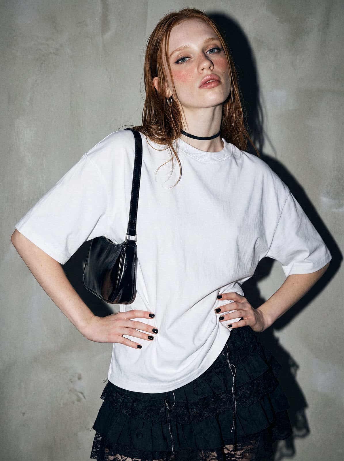 Inside you'll find prompts such as "Using the person in the uploaded reference image, recreate this scene: ультрареалистичный модный портрет молодой девушки ( полностью совпадает со вторым референсом) с естественными пропорциями тела у бетонной стены (полностью совпадает с третьим референсом), обе руки на поясе, голова повернула вбок и запрокинута назад. Крупный кадр. Девушка одета в дерзком рок‑гранж стиле: белая хлопковая оверсайз футболка с воротником из ткани в рубчик ( в точности совпадает с первым референсом), футболка с одной стороны заправлена со второй распущена, низ составляет черная юбка гранж, рюшами слой слое и кружевом, маленькая чёрная глянцевая сумка на плече, черный лак на ногтях и чёрный шейный чокер, за счёт чего весь look выглядит агрессивно‑стильным и немного бунтарским. Взгляд прямой и дерзкий, grunge-soft макияж со стрелками на глазах и контур губ, атмосферу подчеркивают слегка влажные текстурные волосы и нейтральный бетонный фон. Кадр крупный, 90% пространства на фото занимает футболка. Камера и настройки: Полноформатная цифровая камера, объектив 35 мм f/1.8, ISO 400, выдержка 1/160, диафрагма f/2.2, съемка в RAW. Освещение и настроение: Жесткий направленный свет фронтально чуть сверху, эффект вспышки, глубокие, но аккуратные тени, дерзкое ночное настроение. Реалистичность кожи: натуральная текстура кожи с видимыми порами, естественный румянец на щеках, деликатное подповерхностное рассеивание, свет, проникающий сквозь кожу для реалистичного сияния. Волосы и ткань: слегка детализированные пряди с отдельными выбившимися волосками, хлопковая футболка с текстурой и воротником из ткани в рубчик, легкие складки на ткани, торчащие нитки на юбке, металлические серебряные детали. Постобработка: легкий HDR, кинематографическая нейтрально-холодная цветокоррекция, тонкая пленочная зернистость, мягкая кинематографическая ретушь, подчеркивающая натуральную текстуру кожи и мягкий персиковый пушок вдоль линии подбородка и щек, а также легкий влажный блеск на губах." that cover the hero looks from the shoot. Model presets include nano-banana so you can keep renders on-genre. Aspect ratio guidance like portrait_4_3 keeps compositions print-ready. Use the prompt notes below to match wardrobe details, framing, and mood before you hit remix.