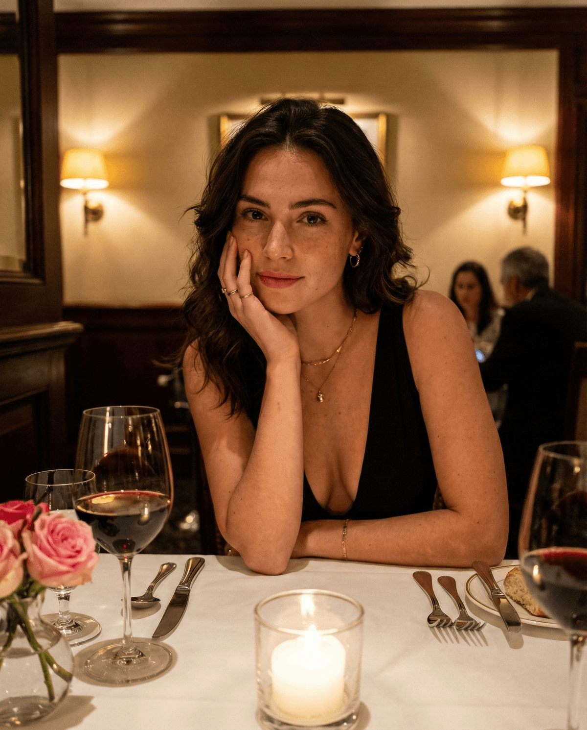 Inside you'll find prompts such as "Ultra-photorealistic iPhone 15 Pro Max Portrait Mode + Night Mode ProRAW photo, vertical 4:5, cinematic candlelit fine-dining atmosphere with authentic smartphone HDR behavior (slight highlight clipping on candles/lamp shades, lifted shadows, mild ISO grain). Realistic phone computational photography look: sharp subject, creamy natural bokeh, subtle edge halation around warm lights, tiny exposure imperfections. NO studio polish, NO beauty filter, NO plastic skin, NO AI-smooth face. Subject: young adult woman (21–26). “mysterious stranger / first date / who is she?” energy. Calm confident expression with soft neutral lips, slightly flirtatious eye contact, relaxed posture. Cinematic facial realism with strong bone structure (defined cheek planes, orbital depth, natural jawline). Natural micro-asymmetry. Skin must be real: visible pores, peach fuzz, faint under-eye texture, small natural blemishes/freckles allowed. Balanced warm skin tones under candlelight (no orange cast, no muddy gray). Hair: dark brunette, medium-length loose waves, natural volume and slight flyaways. A few strands subtly crossing the forehead/cheek for candid realism (not styled perfect). Pose: seated at a white-tablecloth fine dining table. Torso slightly angled. Leaning forward gently. One elbow on the table, hand loosely supporting chin/cheek (relaxed fingers, elegant). Shoulders down. The pose should feel natural, intimate, and quietly magnetic. Add micro-candid imperfection: slight head turn mid-moment, tiny motion micro-blur in loose hair strands ONLY (face/eyes stay tack sharp). Outfit: black deep V-neck sleeveless/halter dress (elegant, minimalist). Luxury matte fabric with visible micro-texture and realistic light absorption. Fit is flattering but tasteful (no exaggerated anatomy). Minimal jewelry: small gold hoops + 1–2 delicate rings + thin chain necklace (subtle). Natural nails. Environment: upscale classic French/European fine dining restaurant at night. Warm tungsten wall sconces, candlelight on table, soft ambient glow. Dark wood paneling, cream walls, elegant corridor depth behind subject. Background has creamy bokeh: warm lamps as soft orbs, faint silhouettes of diners, subtle movement blur in background only. Table details: crystal wine glasses (2), deep red wine with accurate refraction/reflectivity, polished silver cutlery, white porcelain plates, small candle in glass holder (warm flicker), tiny vase with soft pink roses. Lighting: warm candlelight + wall sconces as key light. Soft frontal fill consistent with iPhone Night Mode computational brightening (not a flash, not harsh). Natural bounce off white tablecloth. Gentle rim separation on hair/shoulders. Preserve eye readability with realistic catchlights (candle + lamp reflections). No heavy glam makeup; makeup is minimal and natural. Camera: iPhone 15 Pro Max, Portrait Mode, 35mm equivalent look, f/1.8 aesthetic. Medium close-up framing (upper torso + face dominant). Eyes in top third. Subject occupies ~70–80% of frame. Minimal headroom. Background blurred but readable as a luxury restaurant. Slight handheld feel. Negative / drift blockers: CGI/3D render, cartoon/anime, over-smoothed skin, glass-skin shine, beauty filter face, uncanny symmetry, over-sharpening halos on face, harsh flash, studio lighting, blown-out face, fake bokeh cutout edges, distorted hands/fingers, extra limbs, warped jewelry, weird wine glass geometry, text artifacts, watermarks, logos, overly sexualized posing, exaggerated cleavage, mannequin stiffness." that cover the hero looks from the shoot. Model presets include nano-banana so you can keep renders on-genre. Aspect ratio guidance like portrait_4_3 keeps compositions print-ready. Pose direction covers any, giving you confidence in the body language. Use the prompt notes below to match wardrobe details, framing, and mood before you hit remix.