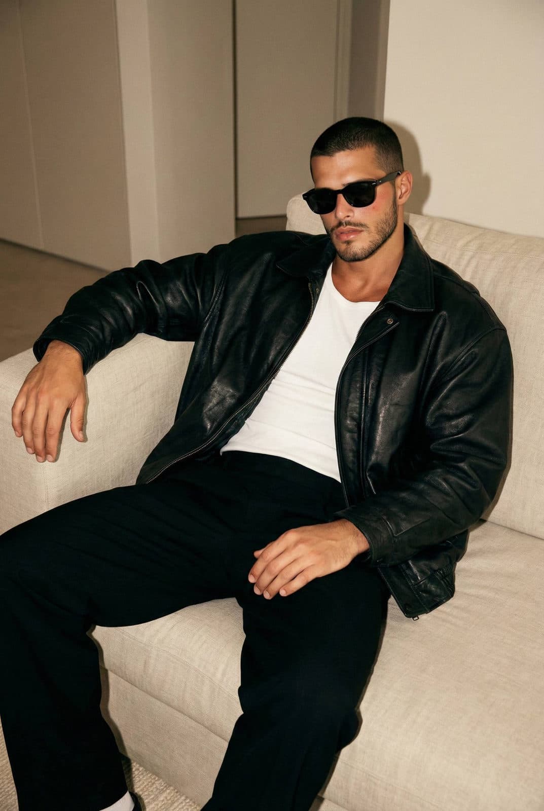 Inside you'll find prompts such as "Using the provided image as a direct visual reference, create a relaxed lifestyle editorial portrait of a man reclining on a light-colored sofa. He is seated in a laid-back pose, legs apart, one arm resting casually, head turned slightly to the side. Expression: calm, self-assured, distant, effortless confidence. Outfit: black oversized leather jacket with visible texture and creases, plain white t-shirt underneath, black relaxed-fit trousers, dark sunglasses. Grooming: clean masculine features. Setting: minimal interior space, neutral tones, soft indoor lighting, no decorative distractions. Mood: understated masculinity, quiet luxury, off-duty model energy, cinematic casualness. Shot from a slightly elevated angle, medium-full framing, natural proportions, realistic fabric textures, no stylization beyond the reference image. soft sculpted face, rosy cheeks, glossy lips, clean defined brows. Neutral warm lighting with slight smartphone front camera flash, balanced shadows. Reference to image. Added fine film grain, realistic skin pores, subtle glow. Pinterest clean-girl meets luxury desert vibe, lifestyle editorial photography, ultra-detailed, 8K quality." that cover the hero looks from the shoot. Model presets include nano-banana so you can keep renders on-genre. Aspect ratio guidance like portrait_4_3 keeps compositions print-ready. Use the prompt notes below to match wardrobe details, framing, and mood before you hit remix.