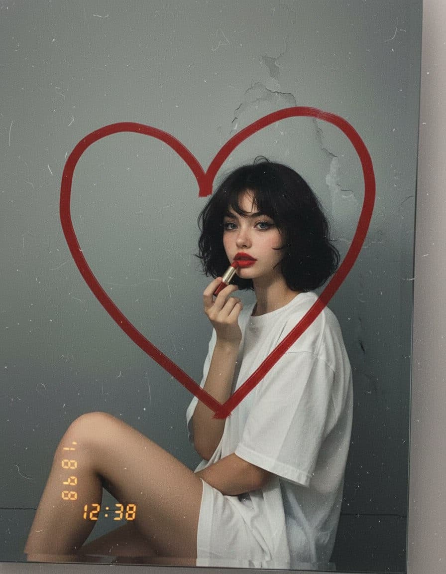 Inside you'll find prompts such as "Using the person in the uploaded reference image, recreate this scene: a candid, retro-inspired mirror selfie capturing the person from the reference image sitting casually on a bathroom counter, applying deep red lipstick. A large red heart is drawn on the mirror, framing their reflection. They wear an oversized T-shirt with rolled sleeves, bare legs visible, creating a relaxed and slightly nostalgic atmosphere. The lighting is soft and dim, evoking a late-night or early-morning mood, with subtle shadows and a touch of film grain for the person from the reference image gazing into the mirror with a calm, introspective expression, lips slightly parted mid-application. Technical details: 35mm film look, muted colors with warm undertones, soft focus edges, and timestamp detail on the lower left corner. The composition centers the heart on the mirror and the face within it, blending intimacy and artistic imperfection. —v 6 —ar 3:4 —style raw —q 2 —s 250" that cover the hero looks from the shoot. Model presets include nano-banana so you can keep renders on-genre. Aspect ratio guidance like portrait_4_3 keeps compositions print-ready. Use the prompt notes below to match wardrobe details, framing, and mood before you hit remix.