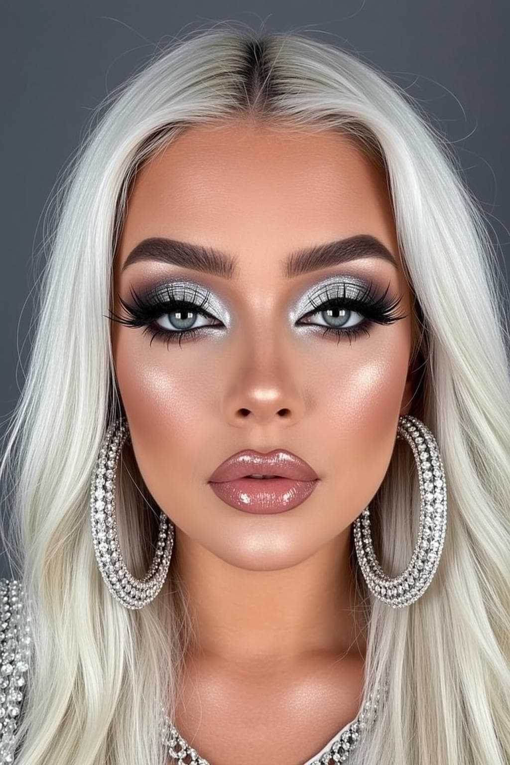 Inside you'll find prompts such as "A photorealistic, close-up portrait of the person from the reference image with striking blue eyes and a neutral expression, facing forward. Her long, platinum hair is styled straight and parted in the center, with some strands falling over her shoulders. Makeup Details: Silver metallic eyeshadow, dramatic winged eyeliner, dense false lashes, sharp arched brows, peachy blush on cheekbones, strong contour, intense highlight, glossy nude lips." that cover the hero looks from the shoot. Model presets include nano-banana so you can keep renders on-genre. Aspect ratio guidance like portrait_4_3 keeps compositions print-ready. Use the prompt notes below to match wardrobe details, framing, and mood before you hit remix.