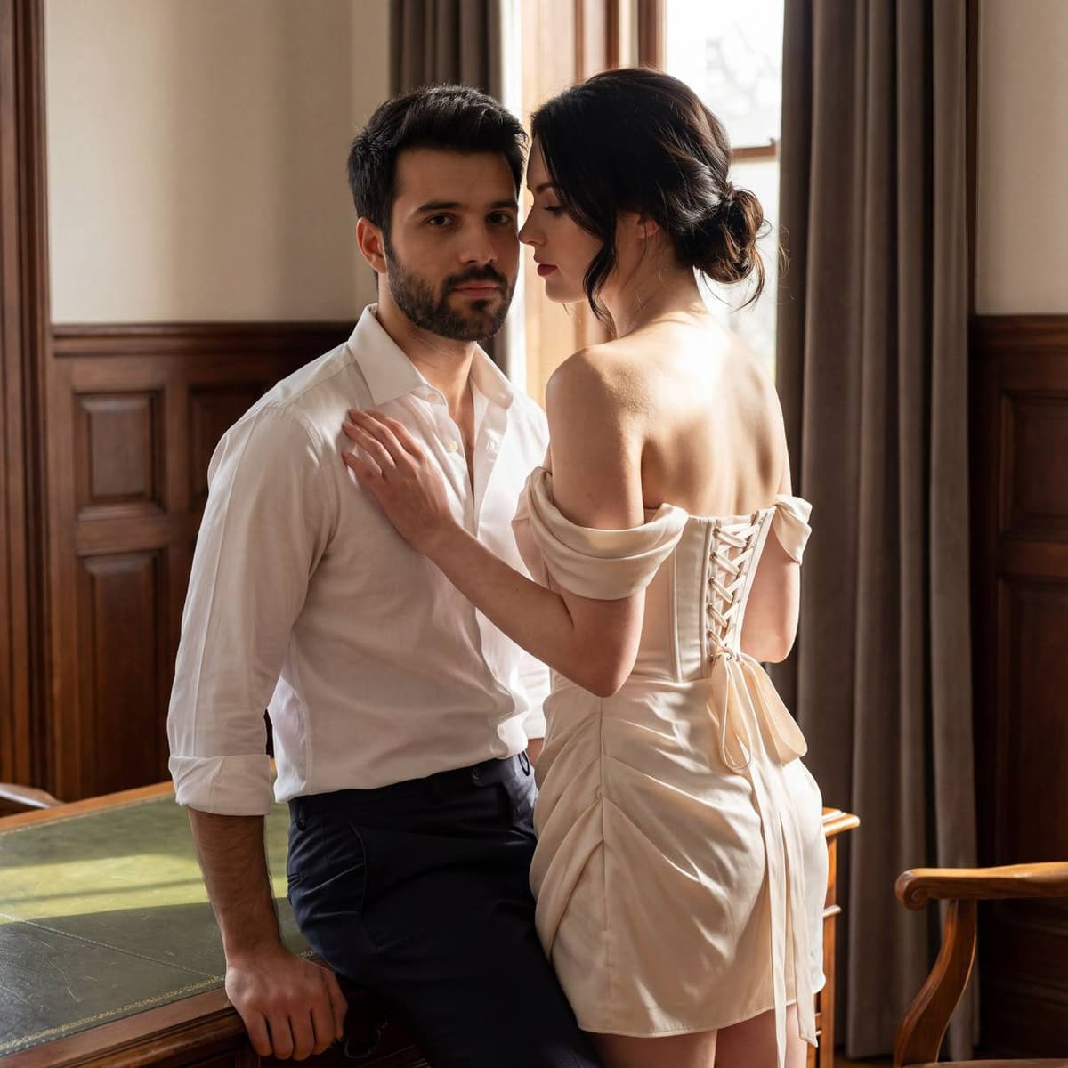 Inside you'll find prompts such as "Using the person in the uploaded reference image, recreate this scene: medium shot, slight low angle, 3/4 diagonal composition. Man sits on the edge of a table half-turned to camera; woman stands very close, leaning toward his face, faces almost touching; his right hand raised toward her back. Faces not altered. Woman: light silk off-shoulder corset mini dress with small dropped sleeves, back laced with light ribbons tied in a long bow, softly draped skirt folds. Matte skin, long lashes, light brown eyeshadow, matte pink lipstick. Hair in a loose low bun with voluminous face-framing strands. Man: cotton long-sleeve shirt, sleeves slightly rolled, top buttons open; dark dress pants. Setting: antique study/library—dark wood wall panels, green leather/cloth desk with wood trim, heavy dark neutral curtains on right, large window behind them, light wall above panels, partial wooden chair visible. Warm natural window light from right of camera and slightly behind (side-back), strong highlights on shoulders/arms/back and tabletop, soft–medium shadows. Photorealistic, high detail, 50mm lens." that cover the hero looks from the shoot. Model presets include nano-banana so you can keep renders on-genre. Aspect ratio guidance like square_hd keeps compositions print-ready. Use the prompt notes below to match wardrobe details, framing, and mood before you hit remix.