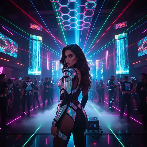 Inside you'll find prompts such as "Using the person in the uploaded reference image, recreate this scene: The person from the reference image with long wavy hair, wearing a revealing black luminescent outfit with holographic fabric and metallic accents. The person from the reference image is standing at a vibrant futuristic nightclub, surrounded by laser beams, projection mapping, and LED panels creating dynamic geometric patterns. A fog machine creates ethereal mist across the dance floor, and a crowd of people dressed in avant-garde cyberpunk fashion fills the space. The person from the reference image's expression is intense and mysterious as they look over their shoulder toward the camera. The lighting is cinematic, with neon underglow, purple and cyan light trails, and a bright blue beam from behind, evoking a sleek sci-fi nightlife atmosphere. The scene feels glamorous, otherworldly, and full of high-tech energy. 8k resolution, sharp focus." that cover the hero looks from the shoot. Model presets include nano-banana so you can keep renders on-genre. Aspect ratio guidance like square_hd keeps compositions print-ready. Use the prompt notes below to match wardrobe details, framing, and mood before you hit remix.