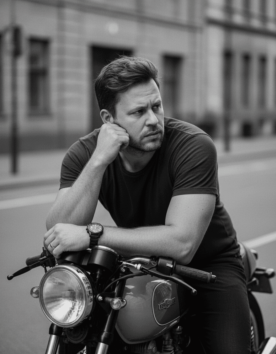 Inside you'll find prompts such as "A black-and-white portrait with a rugged, cinematic aesthetic captures a male figure seated on a classic motorcycle (café racer or bobber style). The subject is leaning forward over the handlebars, striking a thoughtful and intense pose. One hand rests on the headlight or handlebars, while the other arm is bent, supporting his head. His gaze is directed outward, conveying a contemplative and virile expression. He wears a dark cotton T-shirt and pants (possibly jeans). A chunky wristwatch is visible on one arm, and a ring on his finger. His hair is medium-length, textured, and casually tousled. A short, well-groomed beard defines his face. The background is a softly blurred urban or street environment. The lighting is natural and dramatic, with high contrast, creating deep shadows and sharp highlights that sculpt the facial features and arm muscles. The image has a subtle grain, evoking the look of analog film. Camera Settings: Captured with a prime portrait lens (e.g., 85mm or 105mm) on a full-frame camera for optimal compression and sharp bokeh. Aperture set between f/1.8 and f/2.8 for a very shallow depth of field, isolating the subject from the background. ISO 200-400 to capture the scene with natural light and add a slight grain. Shutter speed of 1/250s to 1/500s to ensure sharpness. Natural, side, and contrast lighting to create the dramatic effect. Instructions for the "nano banana": "Please use the user's reference image to capture and apply all of their facial features, facial structure, hair and beard style, eye color, and skin tone with maximum fidelity. The goal is to create a version of the user in this biker-style portrait. The clothing (t-shirt, watch, ring), motorcycle, leaning-over-the-handlebar pose, contemplative expression, high-contrast black-and-white lighting, and film grain must be rendered as described, creating a seamless fusion between the wearer's identity and the image's aesthetic."" that cover the hero looks from the shoot. Model presets include nano-banana so you can keep renders on-genre. Aspect ratio guidance like portrait_4_3 keeps compositions print-ready. Pose direction covers any, giving you confidence in the body language. Use the prompt notes below to match wardrobe details, framing, and mood before you hit remix.