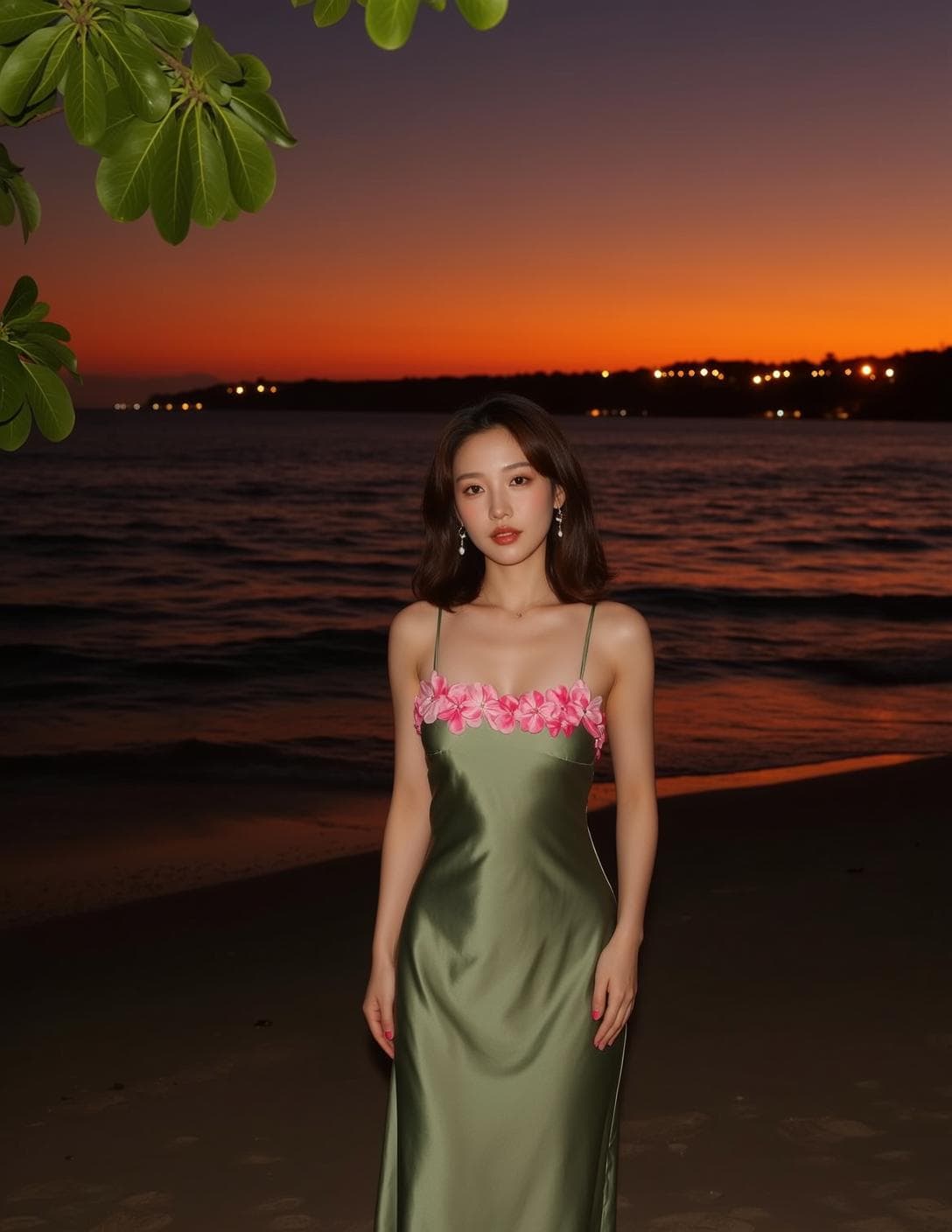 Inside you'll find prompts such as "Using the person in the uploaded reference image (Do not change facial features), recreate this scene: prompt: {"subject":{"description":"a young woman","hair":"dark brown, shoulder-length, slightly wavy","skin":"fair"},"apparel":{"top":"green satin slip dress with pink floral embellishments on the bust","bottom":"","other":""},"accessories":{"eyewear":"","jewelry":[{"type":"drop earrings","material":"pearl"}],"other":"","tattoos":[]},"pose_and_expression":{"pose":"standing, facing forward, hands by her side","expression":"neutral, looking at the camera"},"environment":{"location":"beach at sunset","surface":"sand","objects":["ocean","distant lights on the horizon","tree branches with leaves in the upper left corner"]},"photography_style":{"lighting":"golden hour, soft natural light","aesthetic":"photorealistic, serene"}} featuring a young woman." that cover the hero looks from the shoot. Model presets include nano-banana so you can keep renders on-genre. Aspect ratio guidance like portrait_4_3 keeps compositions print-ready. Use the prompt notes below to match wardrobe details, framing, and mood before you hit remix.