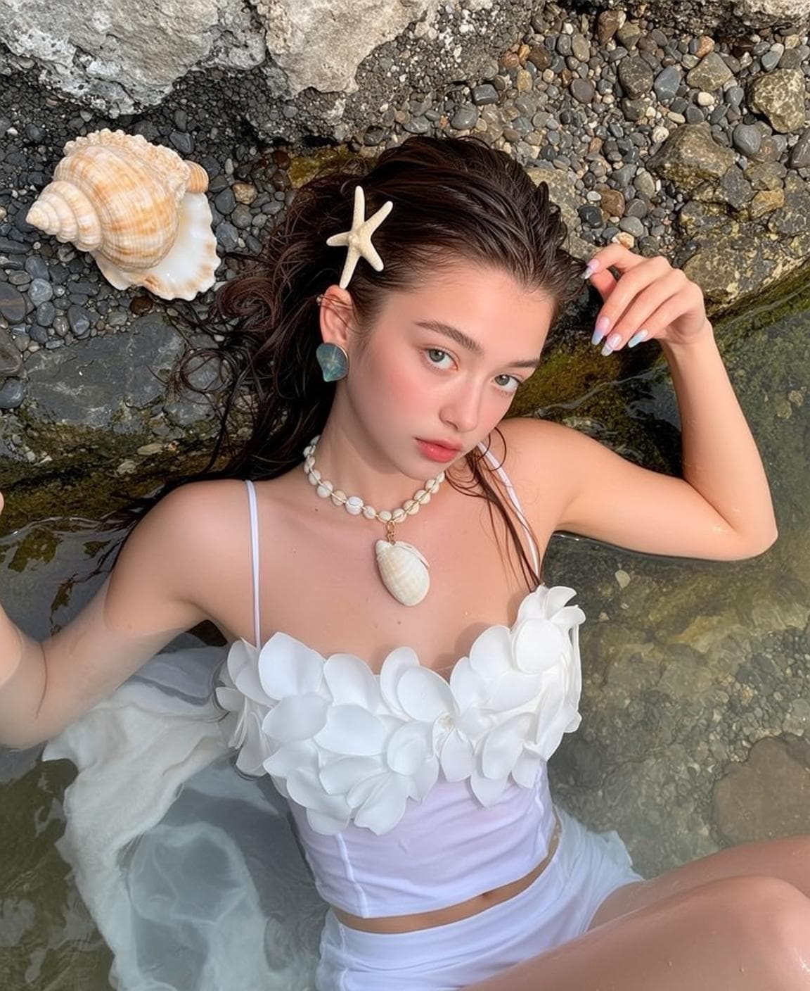 Inside you'll find prompts such as "Using the person in the uploaded reference image (Do not change facial features), recreate this scene: prompt: {"subject":{"description":"young woman","hair":"long wet dark brown hair parted to one side with loose strands","skin":"fair smooth skin"},"apparel":{"top":"white spaghetti strap camisole with ruffled white flower petal details around neckline and bust","bottom":"white shorts","other":""},"accessories":{"eyewear":"","jewelry":["pearl necklace with large white shell pendant","seashell earrings"],"other":"large orange conch shell and starfish pinned in hair on right side","tattoos":[]},"pose_and_expression":{"pose":"reclining on back in shallow water with right arm raised hand near face right elbow propped other arm relaxed by side legs slightly bent","expression":"sultry gaze at viewer with pursed red lips"},"environment":{"location":"rocky beach","surface":"shallow clear water over medium gray pebbles and dark basalt rocks with gentle ripples and tiny air bubbles","props":"large orange conch shell on rock beside head, scattered small white and pink seashells nearby","lighting":"soft golden hour sunlight from above right with warm highlights on wet skin, hair, and fabrics plus caustic light patterns underwater","background":"blurry distant turquoise ocean waves and rugged rocky shoreline"},"image_quality":{"resolution":"8k UHD","style":"hyper-photorealistic","details":"glistening water droplets on fair skin, translucent wet camisole fabric clinging to curves, individual hair strands, sharp focus on sultry eyes and red lips, intricate pearl necklace textures, bokeh depth of field"},"composition":{"angle":"slight overhead from front","emphasis":"face, upper body, and accessories"}}}" that cover the hero looks from the shoot. Model presets include nano-banana so you can keep renders on-genre. Aspect ratio guidance like portrait_4_3 keeps compositions print-ready. Use the prompt notes below to match wardrobe details, framing, and mood before you hit remix.