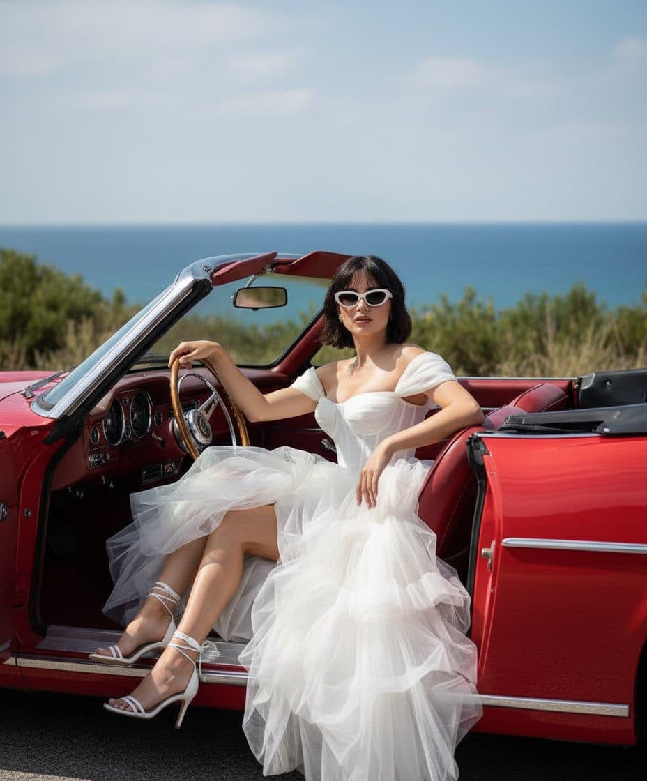 Inside you'll find prompts such as "Use the face, facial expressions, skin tone, and proportions of the user from the uploaded photo. Create a realistic fashion portrait in the sun in the style of a luxury photoshoot. The user is sitting in a vintage red convertible with the top down, one hand on the steering wheel, the other on their knee. The user is wearing a white airy dress with a full tulle skirt, off-the-shoulder neckline, and a corset top. On the feet are white heeled sandals with ties. The user is wearing white sunglasses, looking forward with a slight expression of confidence and calmness. The background is a road by the sea and a landscape with blurred bushes and blue sky. Lighting is bright, daytime, with soft shadows and reflections on the skin and the car. Style: cinematic fashion editorial, luxury lifestyle, summer sunlight, glossy tones, shallow depth of field, natural colors. Aspect ratio 3:4, realistic texture, soft light, emphasis on pose and composition." that cover the hero looks from the shoot. Model presets include nano-banana so you can keep renders on-genre. Aspect ratio guidance like portrait_4_3 keeps compositions print-ready. Use the prompt notes below to match wardrobe details, framing, and mood before you hit remix.