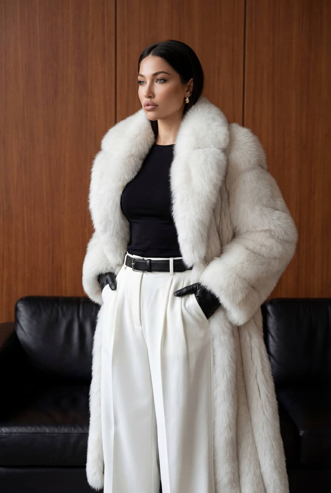 Inside you'll find prompts such as "Reference image: uploaded photo. Recreate the pose, outfit, proportions, lighting, mood, and composition exactly. Do not stylize. Do not reinterpret. A hyper-realistic full-body fashion portrait of a woman standing indoors against a flat vertical wooden wall paneling in a warm brown tone. The background is minimal, clean, modern, with no decor, creating a строгий, дорогой, архитектурный вайб. Pose & body: The woman is standing in three-quarter profile, body slightly turned to the side. Her weight is shifted onto one leg, creating a relaxed but powerful stance. Hands are placed inside the pockets of wide trousers. Shoulders slightly raised due to the heavy fur coat, posture confident, restrained, composed. Outfit: Voluminous white fur coat, oversized, worn open, heavy texture clearly visible. Black fitted long-sleeve top underneath. High-waisted wide white trousers with soft draping. Black leather belt with metal buckle. Long black leather gloves, reaching above the wrists. Minimal gold earrings. Expression & mood: Serious, cold, distant expression. Eyes looking slightly sideways, not directly at the camera. No smile. Editorial, dominant, luxury energy. Environment: Black leather sofa partially visible behind her at waist level. Clean interior, modern apartment or hotel aesthetic. No clutter, no extra objects. Lighting: Soft, natural indoor lighting. No harsh flash. Even illumination with gentle shadows under the coat and along the trousers. Skin tones neutral, realistic. Camera: Full body framing, Eye-level camera, Slight distance from the subject, Vertical composition, Fashion editorial look, but not cinematic, not glossy. Style: Ultra-realistic photography, High detail fabric textures, Natural proportions, No beauty filters, No dramatic color grading STRICT NEGATIVE PROMPTS: no sitting, no dynamic pose, no exaggerated movement, no cinematic lighting, no background changes, no accessories added, no pose changes." that cover the hero looks from the shoot. Model presets include nano-banana so you can keep renders on-genre. Aspect ratio guidance like portrait_4_3 keeps compositions print-ready. Use the prompt notes below to match wardrobe details, framing, and mood before you hit remix.