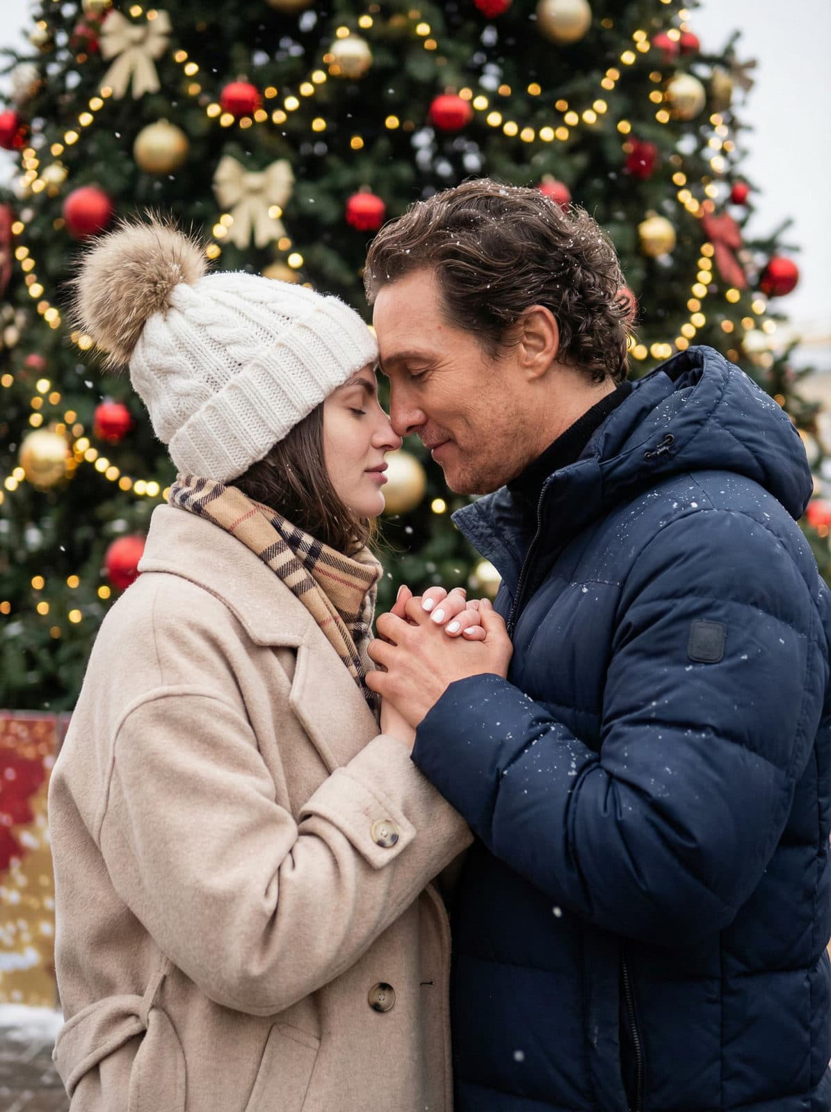 Inside you'll find prompts such as "Using the person in the uploaded reference image, recreate this scene: full cinematic medium shot of a couple standing outside near a decorated Christmas tree, foreheads and noses almost touching, holding hands with fingers intertwined, faces in profile, eyes closed. the person from the reference image wears a voluminous light wool coat, a beige and brown checkered scarf, and a knit hat with a fur pom-pom and glossy nails. the person from the reference image wears a dark blue quilted down jacket with a high collar and a sweater. Snowflakes on clothes and in the air. Blurred background of a street Christmas tree with dark green branches, gold and red ornaments, and warm garland bokeh. Soft natural overcast daylight mixed with warm garland illumination, soft shadows, warm color palette, highly detailed, photorealistic, shot on a 50mm lens." that cover the hero looks from the shoot. Model presets include nano-banana so you can keep renders on-genre. Aspect ratio guidance like portrait_4_3 keeps compositions print-ready. Use the prompt notes below to match wardrobe details, framing, and mood before you hit remix.