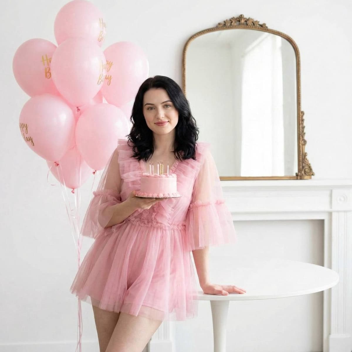 Inside you'll find prompts such as "Using the person in the uploaded reference image, recreate this scene: the person from the reference image standing in a bright room. She leans against a round table and holds a small pink cake with lit candles. She is wearing a, airy pink tulle jumpsuit with ruffles and wide sleeves. She wears an even, matte skin tone, mascara, and pink lips. In the background is a bunch of light pink helium balloons with gold lettering, as well as a mantelpiece and an antique arched mirror. Bright, even, and soft studio lighting, minimal soft shadows, festive, shot with a portrait lens, medium depth of field, sharp focus on the person from the reference image, photorealistic style." that cover the hero looks from the shoot. Model presets include nano-banana so you can keep renders on-genre. Aspect ratio guidance like square_hd keeps compositions print-ready. Use the prompt notes below to match wardrobe details, framing, and mood before you hit remix.